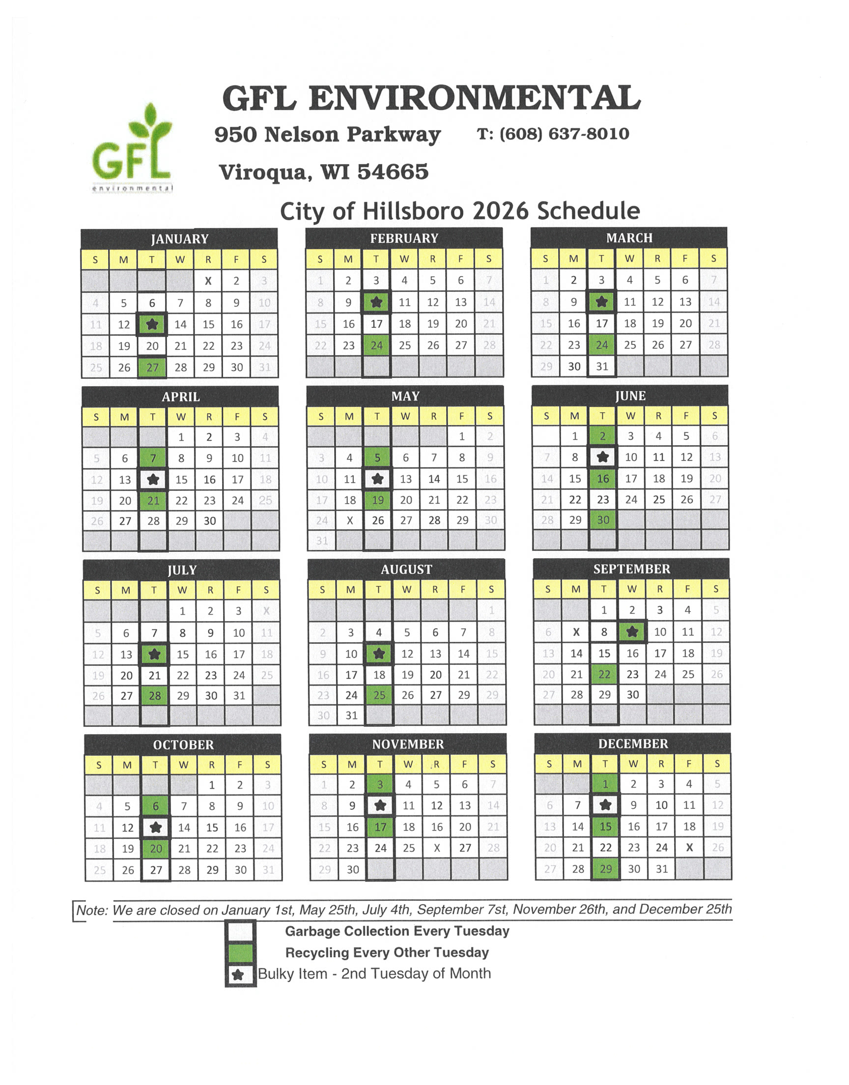 The City of Hillsboro and Southwest Sanitation appreciate your cooperation with these changes! If you have any questions, please call Southwest Sanitation at (608) 637-8010 or City Hall at (608) 489-2521.