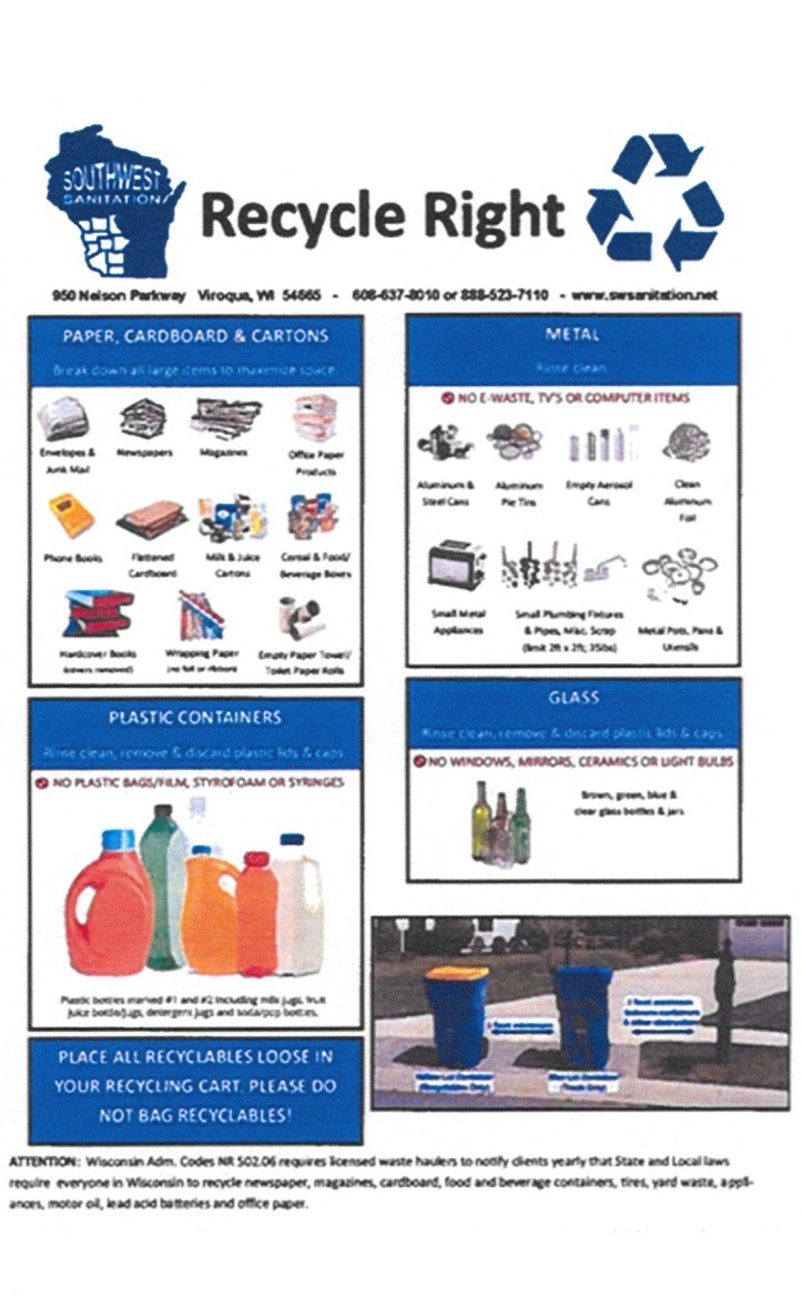 Bulk Day Collection: Southwest Sanitation will be providing a curb side bulk waste pick upon the second collection day of each month. Please note there are new limits on what can be collected. The limits for this pickup shall be 2 medium items or 1 large item. Examples of medium items are end tables, kitchen chairs, etc. Examples of large items are kitchen tables, or recliners or couches. Demolition items are excluded. Loose items and extra bags of any kind are excluded. Items required to be recycled, such as appliances, mattresses, electronics, etc., are not included, but can be arranged for pickup for a fee by contacting Southwest Sanitation at (608) 637-8010. Any bulk waste items deemed excessive or unacceptable will be left at the curb.